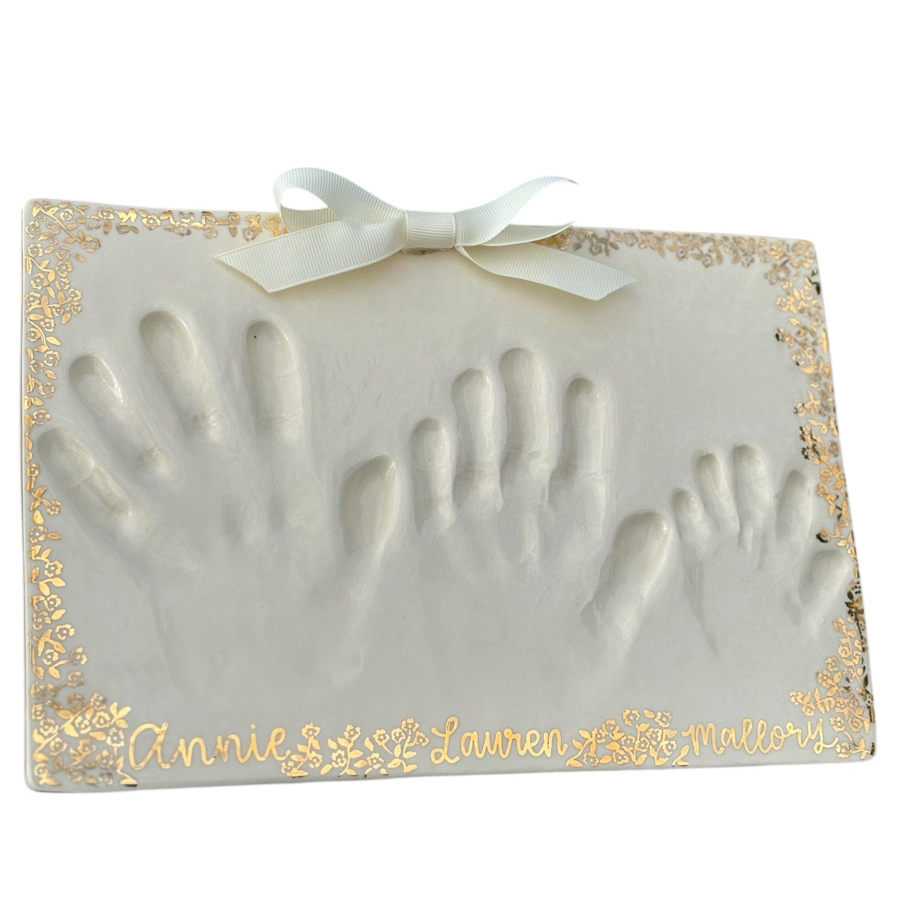 This 22k Gold Floral Border features a ceramic material that is adorned with a beautiful floral design in genuine 22k gold. It also includes the option to capture and showcase your child's hand impressions, making it a sentimental and unique addition to any home decor.