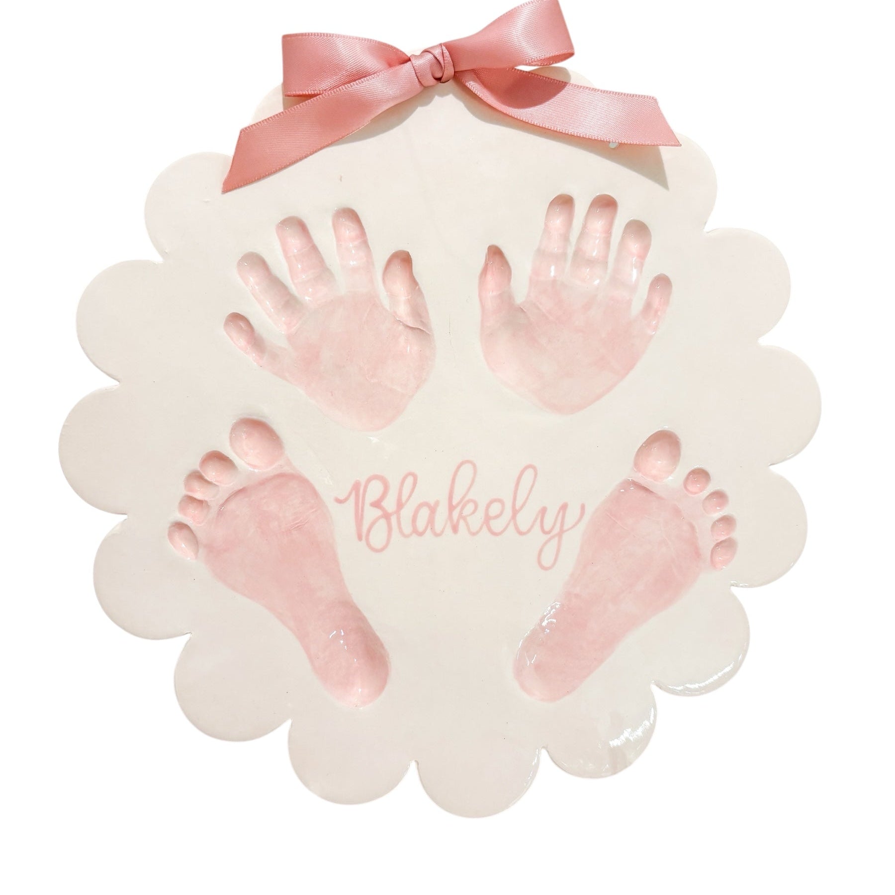 The Petal Plaque: a delicate ceramic piece resembling a flower's petals, adorned with the tiny handprints and footprints of a baby. A timeless keepsake that captures the fleeting moments of childhood with precision and beauty. Perfect for nurseries or as a heartfelt gift for new parents.